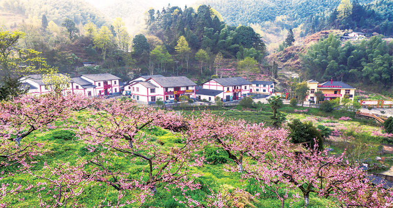 黄桃成为神山村脱贫致富的重要产业,图为黄桃花盛开时的美丽山村。井冈山市委宣传部供图