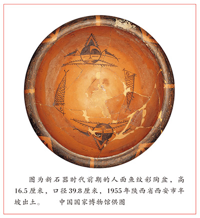 在中国国家博物馆的展厅中,既有陕西半坡出土的人面鱼纹彩陶盆、陕西华县出土的鹰形陶鼎、河南贾湖出土的七孔骨笛、内蒙古翁牛特旗出土的红山玉龙、甘肃出土的马家窑文化涡纹四系彩陶罐,也有山西襄汾陶寺出土的陶壶、浙江良渚出土的双鼻陶壶、四川广汉三星堆出土的青铜面具……