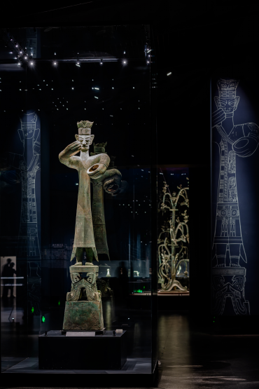 青铜大立人像,人像高180厘米、通高260.8厘米,距今已有3000多年的历史,是世界现存最高、最完整的青铜立人像,被誉为“世界铜像之王”。人像头戴高冠,两臂略呈环抱状构势于胸前,双手手型环握中空,脚戴足镯,赤足站立于方形怪兽座上,身穿窄袖与半臂式共三层衣,衣上纹饰繁复精丽,以龙纹为主,辅配鸟纹、虫纹和目纹等,身佩方格纹带饰。雕像整体形象典重庄严,采用分段浇铸法嵌铸而成,按真人的高矮、比例、动作塑造,对眼、耳及双手作了较大夸张,以此强化人像超凡的一面,制作之精美细腻在夏商周考古史上罕有其匹。