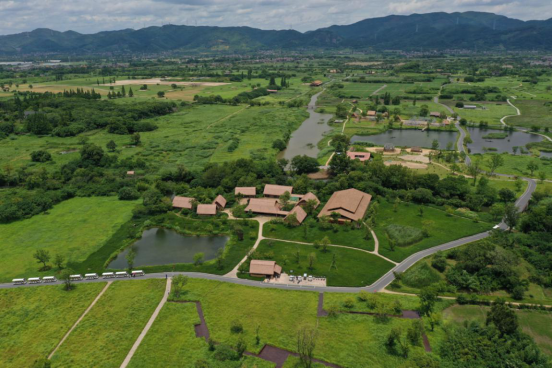 2022年7月6日,良渚古城外围水利系统首次对外开放。图为7月6日拍摄的良渚古城遗址公园(无人机照片)。当日,良渚古城遗址外围水利系统的重要组成部分老虎岭遗址公园正式面向公众开放。世界文化遗产良渚古城遗址位于浙江杭州余杭区。良渚古城外围水利系统位于古城西北方向。整个水利系统的影响范围约100平方公里,由谷口高坝、平原低坝和山前长堤等11条人工坝体和天然山体、溢洪道构成,是中国迄今发现最早的大型水利系统。 新华社记者 黄宗治/摄