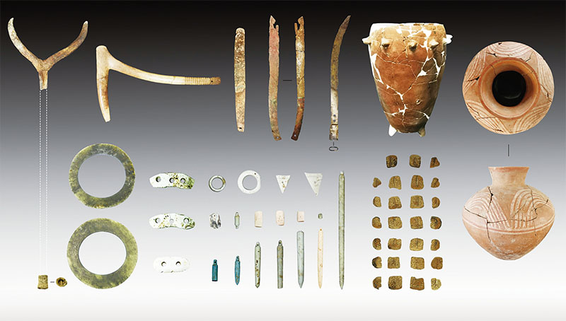 这一时期社会发展的另一项标志是礼器的出现和礼制的初步形成。玉器、漆器、精致陶酒器等都出自各地的顶级墓葬。入选2021年度全国十大考古发现的河南南阳黄山遗址,有数座距今5300年左右的屈家岭文化早期大墓,男性墓主大都随葬品丰富。辽宁建平牛河梁和安徽含山凌家滩大墓中随葬玉人、玉龙、玉鸮、玉龟,凌家滩大墓的随葬品多达300余件。良渚文化大墓也都有玉琮、玉璧等上百件高等级随葬品。入选2021年度全国十大考古发现的山东滕州岗上遗址,大汶口文化中期的大墓中有涂朱骨版、鹿角锄、鹿角叉形杖、鳄鱼骨板、陶鼓、龟甲器等独具海岱地区特征的“礼器”,其中的杖形器是良渚文化象牙权杖的简化版。上述发现表明各地统治阶层掌握了贵重物品的生产和分配,形成了以某些高技术含量的珍贵物品作为礼器、同时以墓葬规模体现墓主人地位的等级制度——礼制。