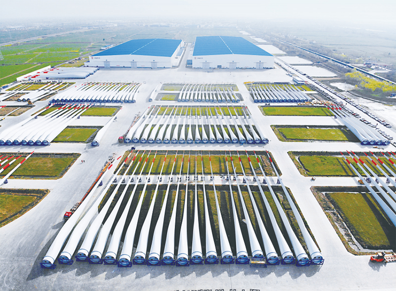中国建材集团风电叶片年总产能19660兆瓦,产品覆盖1.0兆瓦到15.0兆瓦系列,拥有100余个型号,开发出112米海上风电叶片。图为中国建材集团风电叶片阜宁生产基地。 中国建材集团供图