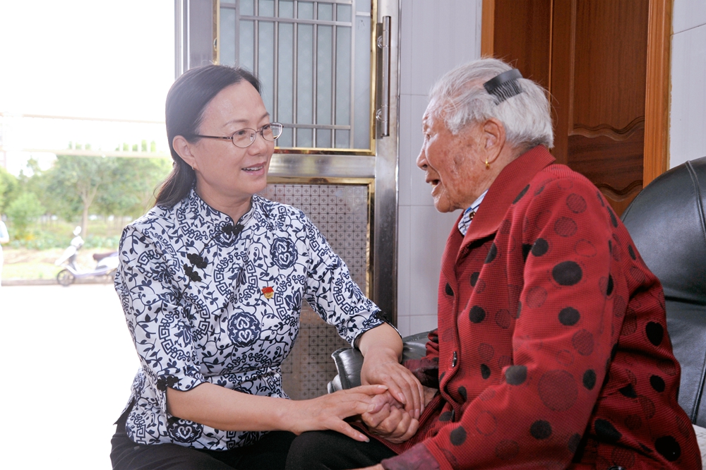 2001年,在亲情与乡情召唤下,郁霞秋放弃公立医院的“铁饭碗”,回到长江村创业;2013年,郁霞秋当选为长江村党委书记,带领乡亲们走向共同富裕。图为郁霞秋看望村里百岁老人。张家港市金港街道长江村党委供图