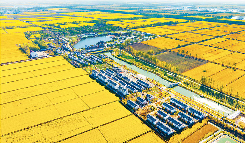 新时代十年,我国谷物总产量稳居世界首位。图为2022年11月2日,江苏省宿迁市泗洪县石集乡4.9万亩优质水稻迎来丰收季,一排排崭新的民居与金色的稻田相映生辉,构成了一幅美丽的秋日田园画卷。 人民图片 张连华/摄