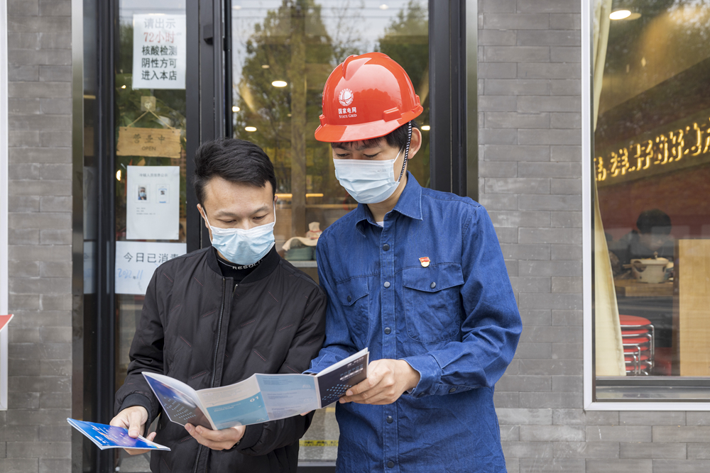 图片图为国网北京城区供电公司“三零”服务项目经理颜世杰为“伙凤凰”餐饮服务有限公司负责人介绍“三零+”服务内容。国网北京城区供电公司供图 朱毓凝/摄