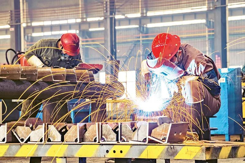 就业是最基本的民生。民营企业是吸纳就业的“蓄水池”和“稳定器”,充分挖掘民营企业就业潜力对缓解就业市场压力有重要作用。图为2023年1月6日,河南省一家民营企业的工人正在焊接“武汉—南昌特高压钢管塔”项目订单组装件。人民图片 赵永涛/摄