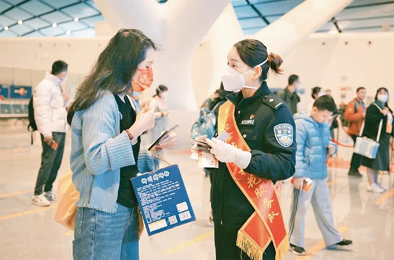 2023年2月6日,在广西南宁吴圩国际机场,全国三八红旗集体南宁边检站“朱槿花服务队”队员为旅客解答出入境相关问题。全国妇联供图