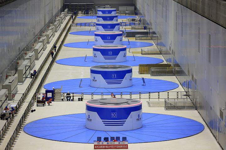 2022年11月5日18时55分,白鹤滩水电站10号机组顺利通过72小时试运行,正式投入商业运行。图为白鹤滩水电站右岸地下厂房发电机组。新华社发 闫科任/摄