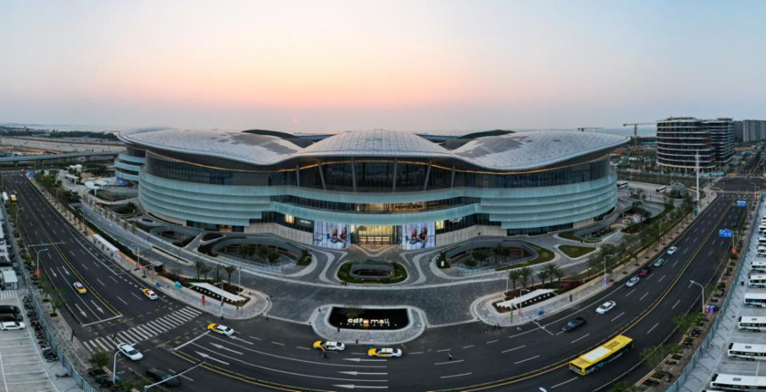 图为2023年4月4日,航拍夕阳下的海口国际免税城。新华社记者 杨冠宇/摄