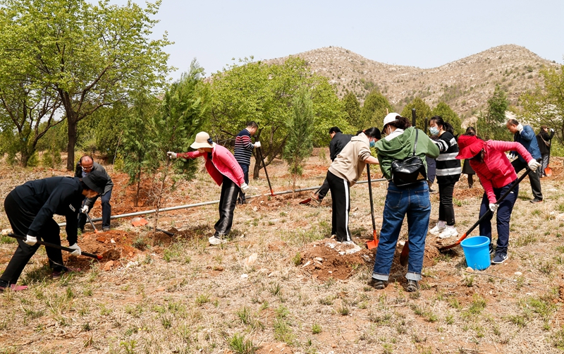 2023年4月19日,在“首都互联网+全民义务植树”(房山)基地,志愿者参加植树造林活动。张琳/摄