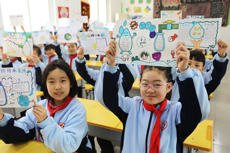 2023年3月22日,河南省平顶山市宝丰县山河路小学学生展示自己制作的节水护水画报。当日是世界水日,全国各地举办形式多样的爱水护水活动,增强人们节水爱水护水意识。新华社发 何五昌/摄