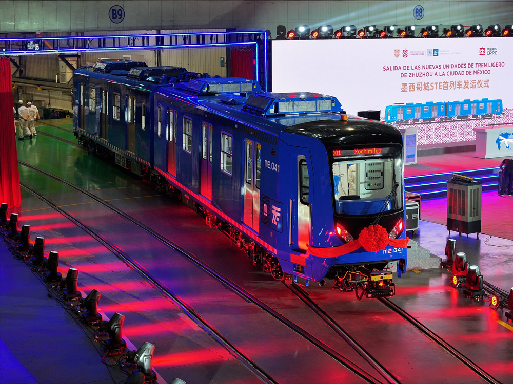 2023年9月9日,中国中车为墨西哥首都墨西哥城定制的铰接式轻轨列车首列车在中车株洲电力机车有限公司下线。为满足墨西哥城城区蜿蜒曲折的线路条件和大客流出行需求,该项目采用具有完全知识产权的铰接式转向架的轻轨列车,列车具有编组灵活、安全舒适等特点。新华社记者 陈泽国/摄