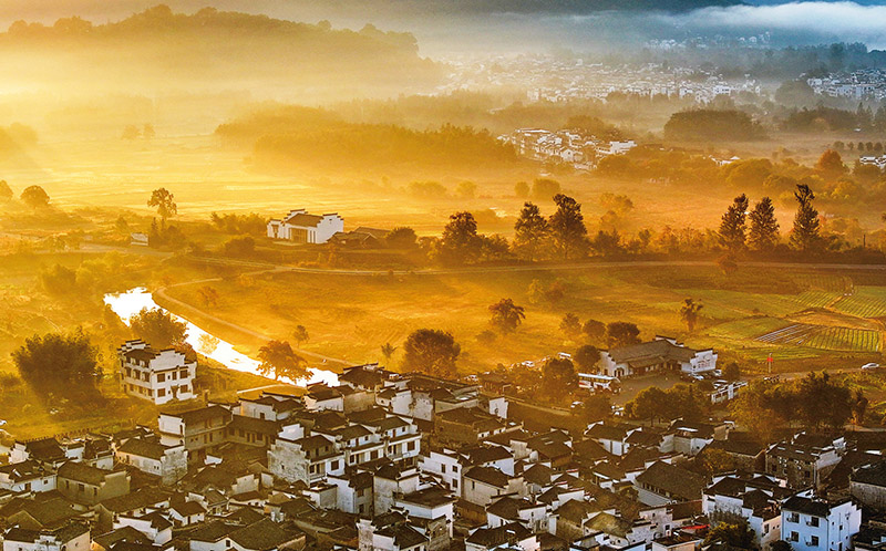 党的十八大以来,我国生态文明建设从理论到实践都发生了历史性、转折性、全局性变化,美丽中国建设迈出重大步伐。图为2023年11月1日在安徽省黄山市黟县宏村镇卢村拍摄的秋景(无人机照片)。新华社发 施亚磊/摄