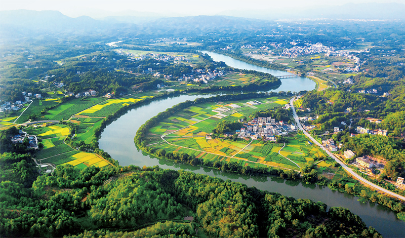 图为位于福建省龙岩市长汀县的汀江国家湿地公园三洲镇曾坊村河段。长汀曾是中国南方红壤区水土流失最严重的县之一。习近平总书记在福建工作期间,先后5次赴长汀调研,持续推动水土流失治理。一任接着一任干,如今,长汀水土流失治理成为全球生态修复典型。福建日报社供图