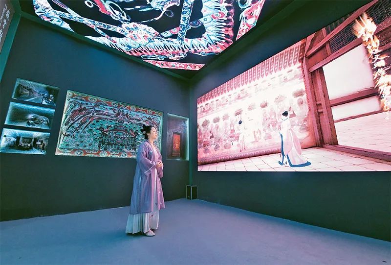 图为2023年6月8日,一名身着传统服饰的观众在第十九届中国(深圳)国际文化产业博览交易会甘肃展台观看数字敦煌展览。新华社记者 梁旭/摄