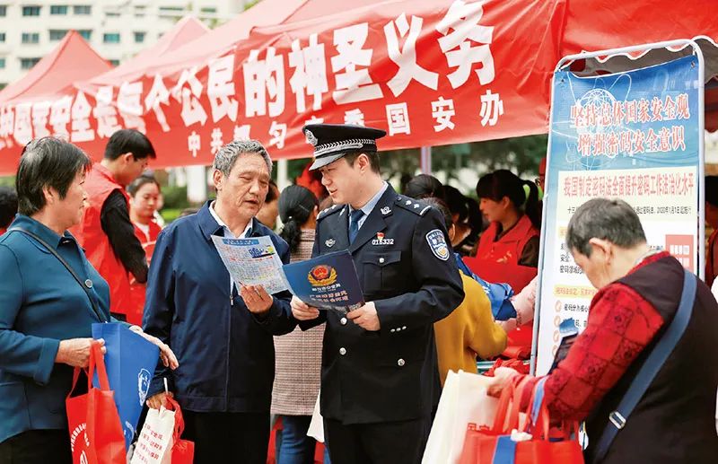 党的十八大以来,在以习近平同志为核心的党中央坚强领导下,我国经受住了来自政治、经济、意识形态、自然界等方面的风险挑战考验,国家安全得到全面加强,为党和国家兴旺发达、长治久安提供了有力保证。图为2023年4月15日,在贵州省黔南布依族苗族自治州都匀市人民广场,民警向市民讲解国家安全等法律法规知识。当日是第八个全民国家安全教育日,各地开展形式多样的国家安全教育主题活动,提高人们的国家安全意识。 新华社发 肖伟/摄