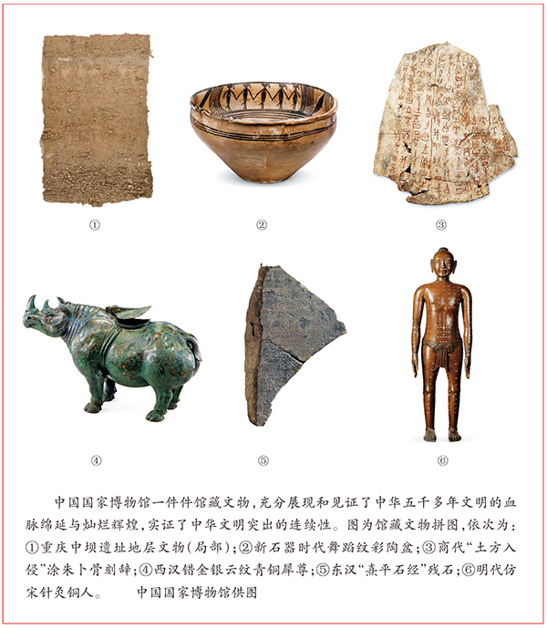 习近平总书记高度重视中华文明的传承与发展,强调中华文明具有突出的连续性,从根本上决定了中华民族必然走自己的路。中华文明是世界上唯一绵延不断且以国家形态发展至今的伟大文明。中华文明源远流长、博大精深,是中华民族独特的精神标识,是当代中国文化的根基,是维系全世界华人的精神纽带,也是中国文化创新的宝藏。如果不从源远流长的历史连续性来认识中国,就不可能理解古代中国,也不可能理解现代中国,更不可能理解未来中国。国家博物馆现有藏品143万余件,藏品体系完整,历史跨度巨大,器物形制多样,充分展现和见证了中华五千多年文明的血脉绵延与灿烂辉煌。其中许多代表性馆藏文物,实证了五千多年中华文明突出的连续性。