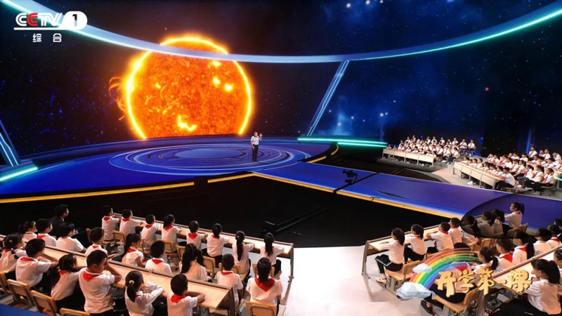 2023年《开学第一课》以“强国复兴有我”为主题,从传统文化、文明探源、生态文明、乡村振兴、国防教育、科技创新等多个方面,全景展示中国式现代化的万千气象。图为中国科学院高能物理研究所研究员、“拉索”(LHAASO)首席科学家曹臻在向同学们介绍世界上海拔最高、规模最大的宇宙射线观测装置“拉索”的前世今生。 教育部供图