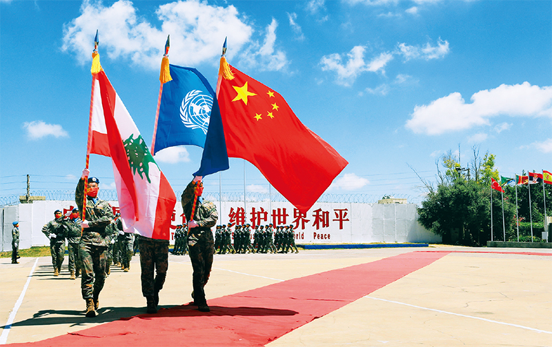 随着全球安全倡议等中国方案得到越来越多认同,构建人类命运共同体成为越来越多国家的共识。2022年7月1日,联合国驻黎巴嫩临时部队(联黎部队)授予中国第20批赴黎巴嫩维和部队全体410名官兵联合国“和平勋章”,以表彰他们为黎巴嫩南部地区和平稳定作出的突出贡献。图为在黎巴嫩南部辛尼亚村的中国维和部队营区,中国维和部队官兵在受勋后通过观礼台。新华社记者 刘宗亚/摄