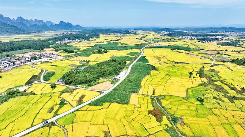 粮食安全是“国之大者”。2023年,我国粮食产量再创历史新高,连续9年保持在1.3万亿斤以上,发挥了安民心、稳大局的“压舱石”作用。图为2023年10月31日拍摄的广西柳城县古砦仫佬族乡云峰村稻田景色。新华社发 黎寒池/摄