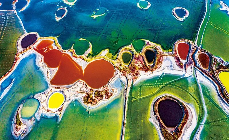 党的十八大以来,水利部门深入实施水生态保护治理,推动江河湖泊面貌实现根本性改善。图为山西运城盐湖色彩斑斓的景观(无人机照片)。新华社发 薛俊/摄