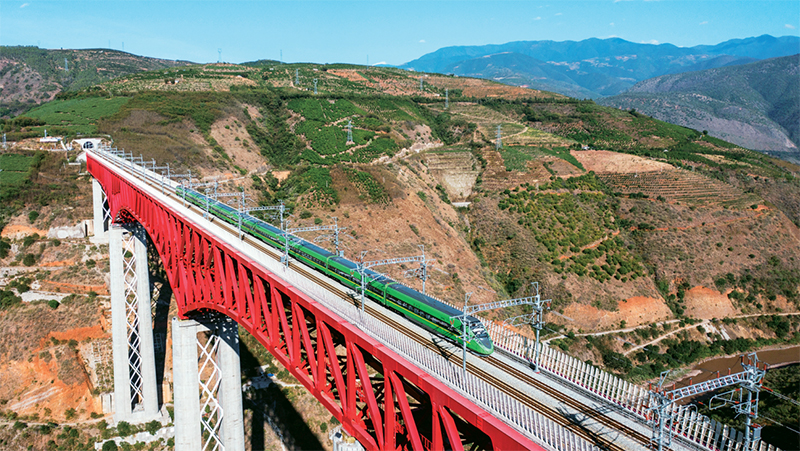 中交集团参建的中老铁路是“一带一路”建设重点项目,于2021年12月3日建成通车。中老铁路是首个以中方为主投资建设运营,全线采用中国技术标准、使用中国设备、与中国铁路网直接连通的国际铁路项目。图为“复兴号”列车通过中老铁路元江特大桥。新华社记者 胡超/摄