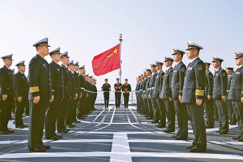图为2023年10月,南昌舰官兵举行仪式,迎接南昌舰入列当天天安门广场升起的国旗。海军政治工作部宣传局供图