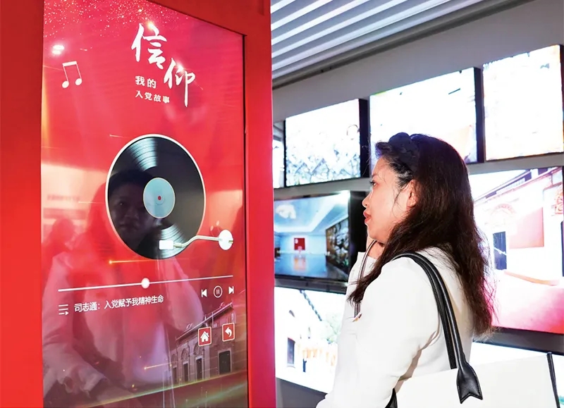 2023年9月11日,“永恒的誓言——中国共产党入党宣誓文物史料专题展”开幕式在中共一大纪念馆举行。展览展出文物史料270件(套),引领观众在入党誓词的发展演变中领会中国共产党人的初心和使命,从践行誓言的典范中感悟铮铮誓言中的思想内涵与精神力量。图为当日,参观者通过多媒体装置聆听普通党员讲述自己的入党故事。新华社记者 刘颖/摄