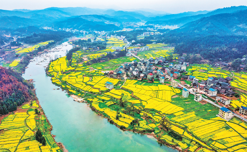 民族要复兴,乡村必振兴。财政部门完善多元化投入机制,加快农业农村现代化,推进乡村全面振兴。图为2024年3月9日,湖南省怀化市通道侗族自治县县溪镇香坪村,金黄的油菜花田与村庄、青山、绿水相互辉映。人民图片 田其珍/摄