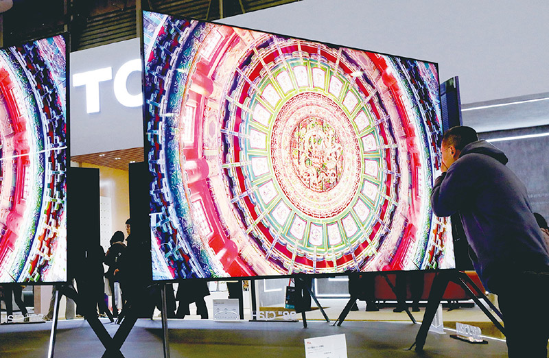 3月14日,2024年中国家电及消费电子博览会在上海新国际博览中心开幕。全球家电及消费电子领域顶流品牌在博览会上齐聚一堂,集中展示各自最新的创新成果。图为一名参观者在一家公司展台上观察一款电视展品的屏幕。新华社记者 方喆/摄