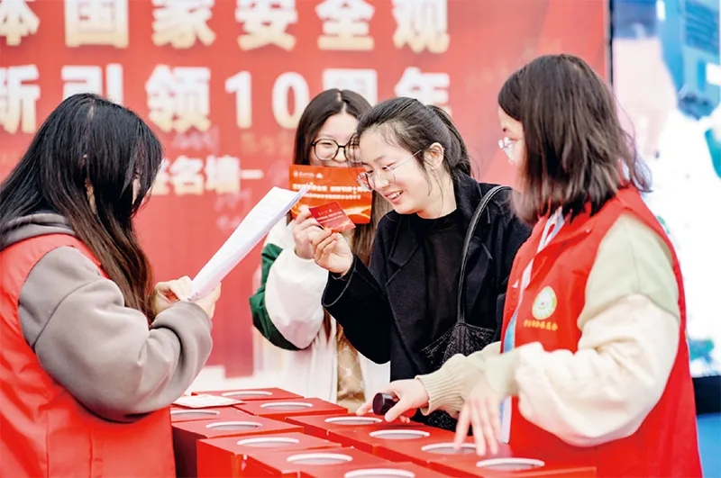 2024年4月15日是第九个全民国家安全教育日,各地开展丰富多彩的活动,积极宣传普及国家安全知识。图为2024年4月8日,苏州城市学院师生参加“总体国家安全观”知识问答等互动活动。江苏省苏州市吴中区委办公室供图