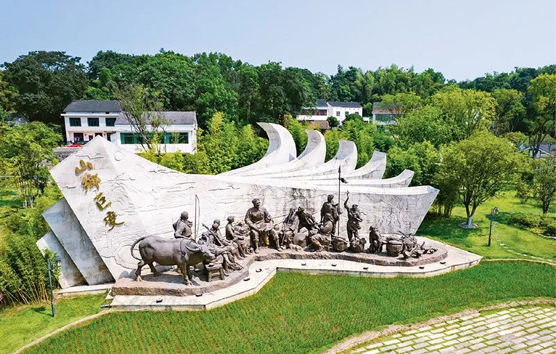 1955年秋,47岁的周立波整理行装,从北京一路南下,举家搬回老家湖南益阳清溪村。67年后,在这里,中国作家协会启动了“新时代山乡巨变创作计划”和“新时代文学攀登计划”两项重大文学行动。图为2022年8月1日拍摄的湖南省益阳市清溪村清溪广场。新华社记者 陈思汗/摄