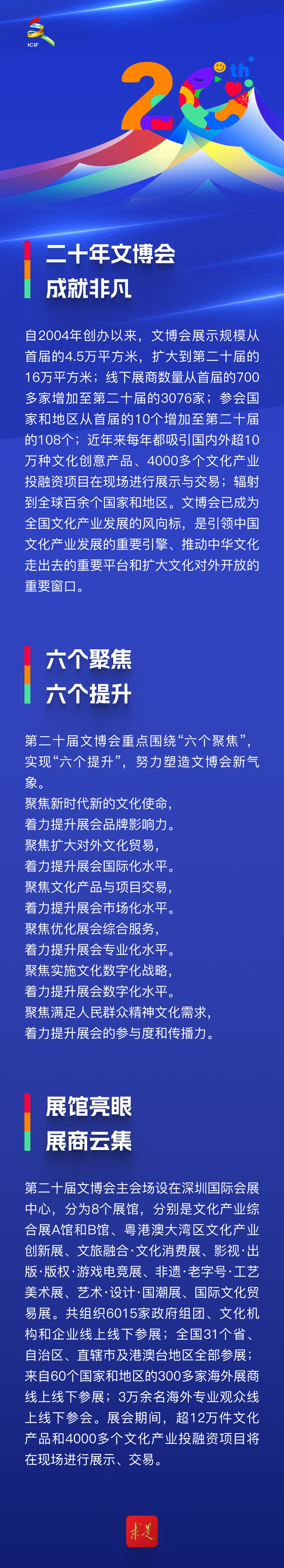 第二十届中国(深圳)国际文化产业博览交易会(以下简称“文博会”)于5月23日在深圳开幕。自2004年创办以来,文博会的国际化、市场化、专业化、数字化水平稳步提升,既展现了我国文化产业高质量发展的全新图景,也诠释了中华民族文化自信的时代风采。今年文博会迎来了第二十届,这是深入学习贯彻习近平文化思想,落实全国宣传思想文化工作会议精神,以新质生产力赋能文化产业繁荣发展的关键举措。本届文博会进一步扩大展会规模,优化展会结构,强化交易功能,提升服务质量,努力打造国际文化产业头部展和最具影响力的文化产品贸易平台,为推动文化繁荣、建设文化强国、建设中华民族现代文明作出新贡献。