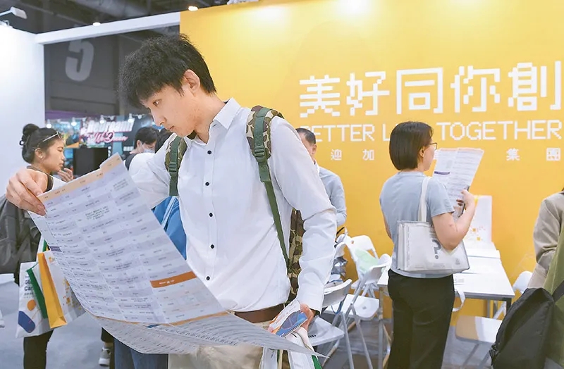 在粤港澳三地和有关部门有力推动下,大湾区建设热潮澎湃,城市之间“互相奔赴”密集涌现,创新驱动力不断增强。图为2023年11月4日,在“创新香港—国际人才嘉年华2023”上,一名求职者浏览华润公司的招聘信息。新华社记者 陈铎/摄