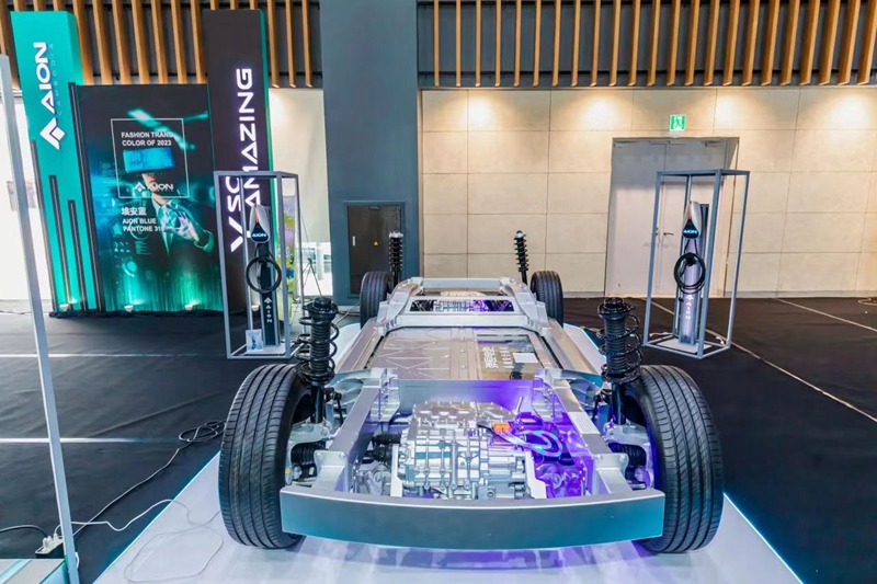 图为搭载了弹匣电池等技术的汽车底盘展示。广汽埃安新能源汽车股份有限公司供图