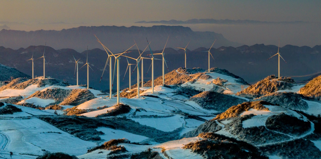 我国持续推进产业结构和能源结构调整,为能源电力绿色低碳转型奠定了坚实基础。图为2024年1月24日拍摄的湖北省宜昌市秭归县云台荒风力发电场。人民图片 雷勇/摄