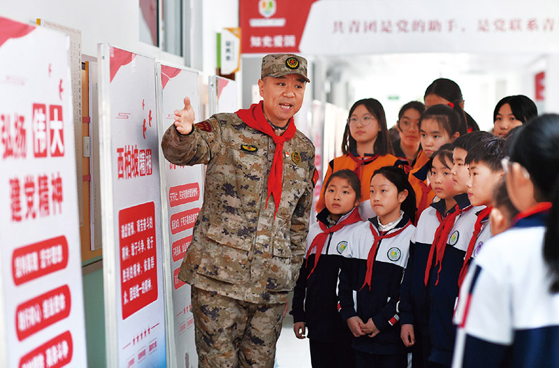 树高千丈必有根,江流万里总有源。读懂中国共产党,必须读懂中国共产党的精神;读懂中国共产党的精神,必须读懂中国共产党的精神之源。图为2024年3月18日,在山东省青岛市市北区延安二路小学举行“国防教育进校园”主题活动上,宣讲员为学生们讲述伟大建党精神。中新社发 王海滨/摄