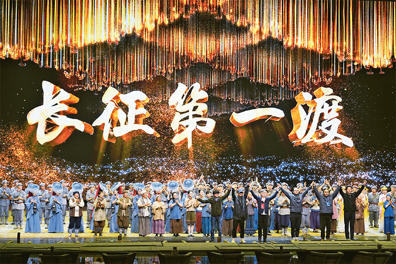 红军将士用生命和热血铸就的伟大长征精神,是革命文化的重要组成部分,具有穿越时空的强大感召力。2023年3月23日,大型红色文旅史诗《长征第一渡》在江西于都长征大剧院首演,观众在沉浸式体验中感受长征时期的峥嵘岁月。图为演出现场。 新华社记者 万象/摄