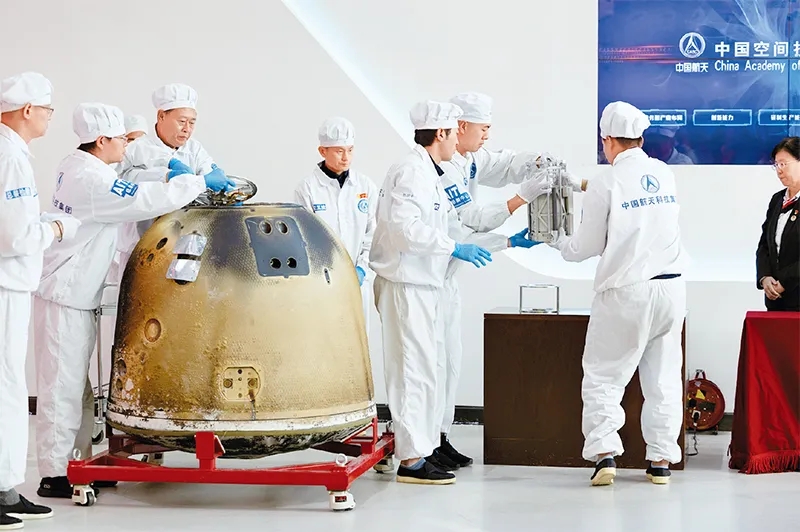 图为2024年6月26日,在中国航天科技集团五院举行的嫦娥六号返回器开舱仪式现场,科研人员取出月球样品容器准备称重。经测算,嫦娥六号任务采集月球背面样品1935.3克。 新华社记者 金立旺/摄
