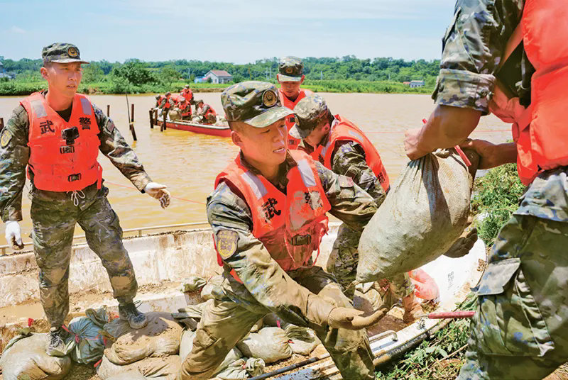 湖南省岳阳市华容县团洲垸洞庭湖一线堤防发生决口后,解放军和武警部队官兵、民兵多支力量全力开展巡堤固坝、封堵管涌等任务作业。图为2024年7月8日上午,武警湖南总队组织官兵在堤边搬运沙袋,封堵突发管涌。 武警湖南总队 张森/摄