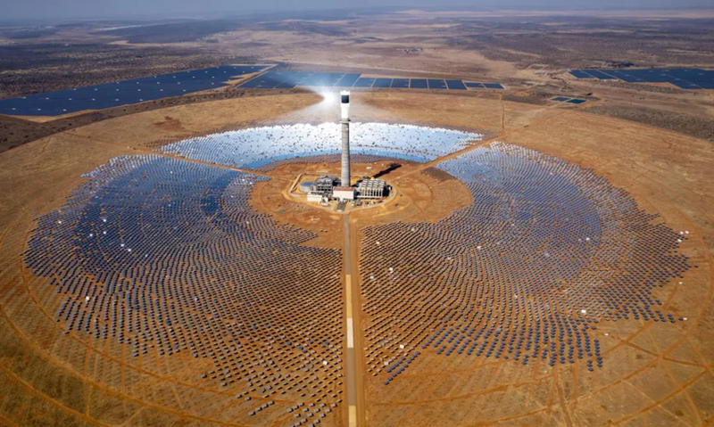 图为2024年8月20日在南非北开普省拍摄的南非红石100兆瓦塔式熔盐光热电站项目(无人机照片)。该项目由中国企业承建,是撒哈拉以南非洲首个塔式熔盐光热电站项目,也是南非最大可再生能源投资项目之一。新华社记者 张誉东/摄