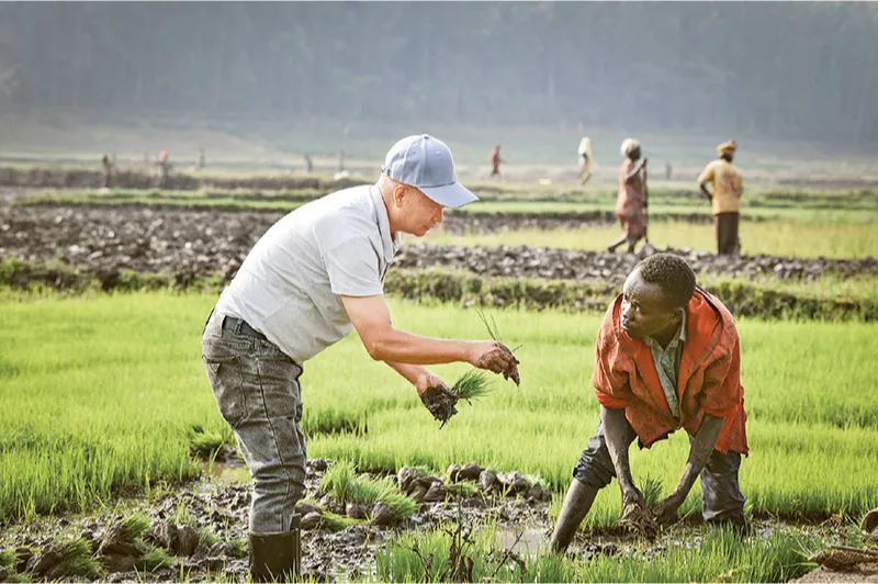 近年来,中非农业合作不断深化,中国农作物品种和农科技术正跨越山海,在非洲大陆生根发芽,把沃土变良田。图为2024年8月14日,在卢旺达南方省胡耶区的中国援卢旺达农业技术示范中心,中国水稻专家在稻田里指导当地稻农进行秧苗移栽。新华社记者 韩旭/摄