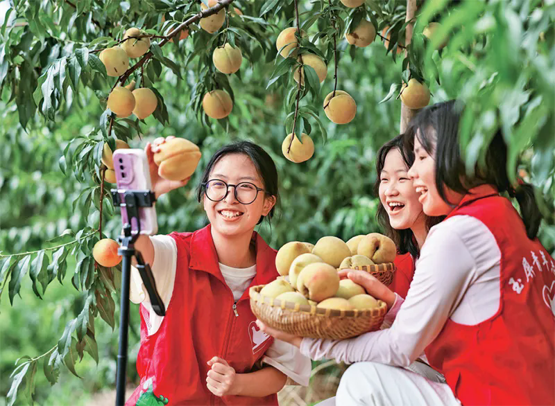 党和人民事业发展离不开一代又一代有志青年的拼搏奉献。图为2024年7月30日,在贵州省铜仁市玉屏侗族自治县新店镇新店村黄桃种植基地,青年志愿者帮助果农直播推销黄桃。 人民图片 胡攀学/摄