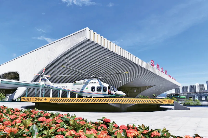 2024年6月28日,直升机在深圳北站旁的停机坪等待起飞。当日,由深铁集团和东部通航合作共建的首个“低空+轨道”空铁联运项目在深圳北站枢纽东广场正式开航,将为旅客提供深圳空铁交通一站式接驳服务。新华社记者 毛思倩/摄
