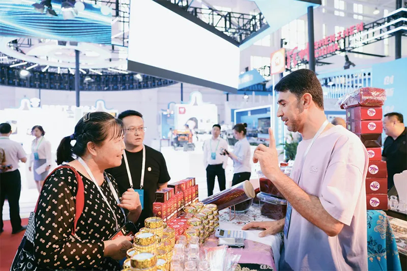 2024年8月17日,第十四届中国新疆喀什·中亚南亚商品交易会在新疆喀什开幕,来自35个国家和地区的158家外商企业、550家国内企业参展。图为开幕当日,国外参展商向参观者介绍商品。新华社记者 尚升/摄