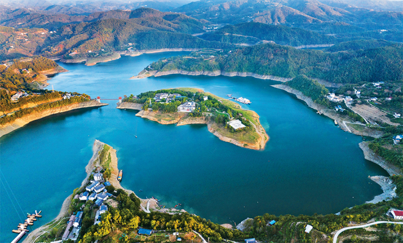 新时代以来,在习近平生态文明思想科学指引下,生态文明建设从理论到实践都发生了历史性、转折性、全局性变化,生态文明体制改革纵深推进,生态文明制度体系基本形成,生态环境质量持续改善。陕西省安康市多年来通过建立“河湖长制+志愿者”护河机制,扎实推进汉江水质保护工作,使汉江出境断面水质稳定保持国家地表水Ⅱ类标准。图为2024年11月2日拍摄的安康汉江瀛湖库区景色(无人机照片)。新华社记者 邵瑞/摄