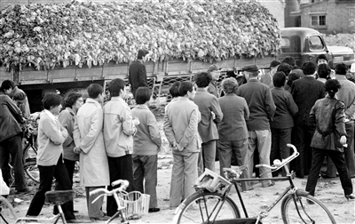 地处华北平原的北京市冬季蔬菜品种少,因此价格低廉、易贮存的大白菜成为居民饭桌上的“当家菜”。这是1988年11月12日,北京市民在一个昼夜营业的冬贮白菜销售点排队购买白菜。(资料图片)