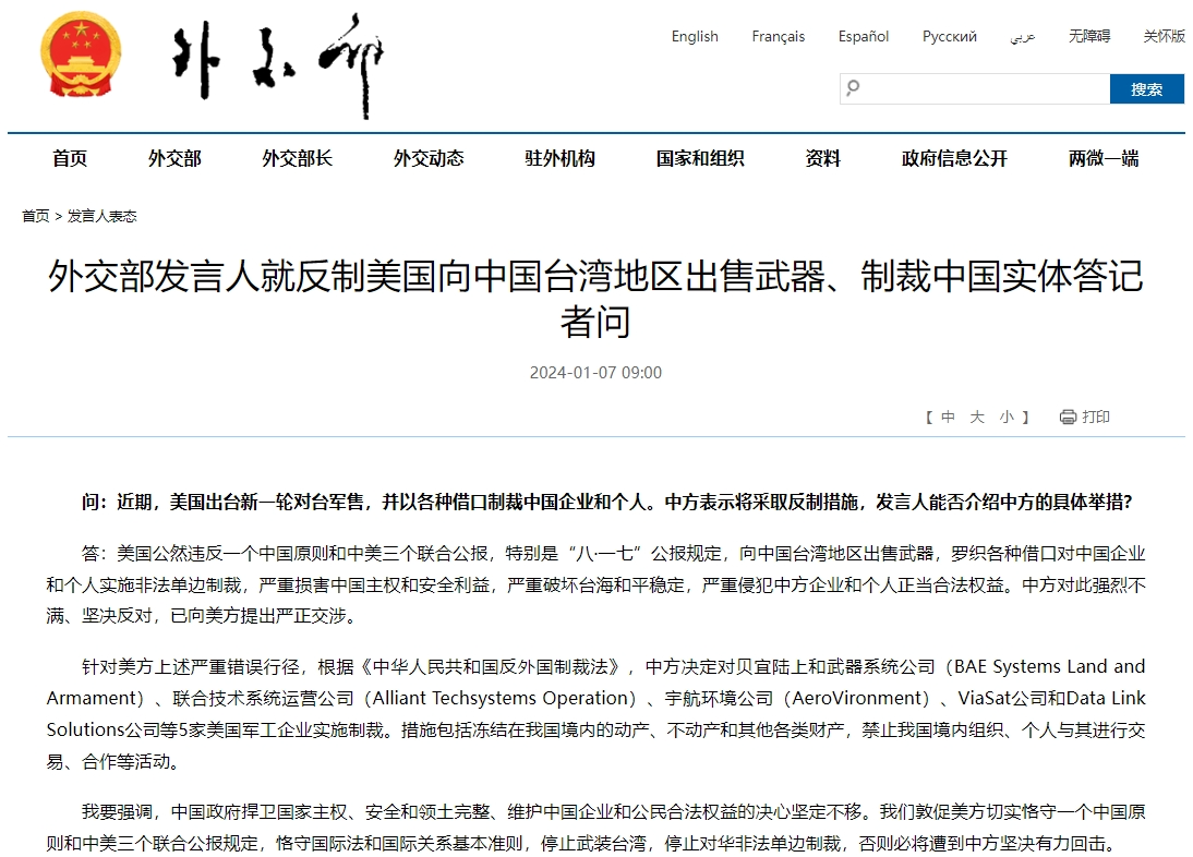针对美方上述严重错误行径,根据《中华人民共和国反外国制裁法》,中方决定对贝宜陆上和武器系统公司(BAE Systems Land and Armament)、联合技术系统运营公司(Alliant Techsystems Operation)、宇航环境公司(AeroVironment)、ViaSat公司和Data Link Solutions公司等5家美国军工企业实施制裁。措施包括冻结在我国境内的动产、不动产和其他各类财产,禁止我国境内组织、个人与其进行交易、合作等活动。
