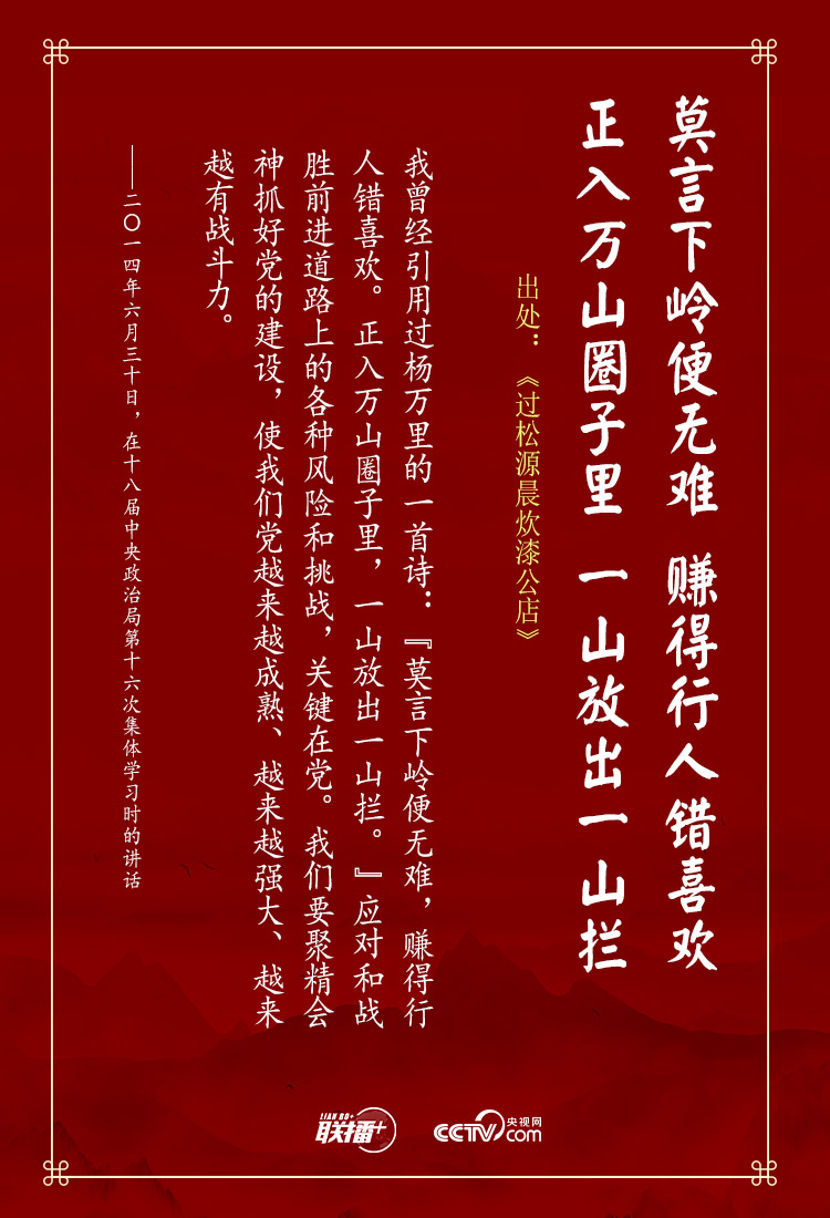 文章引用了杨万里的一首诗,借以表达实现“两个一百年”奋斗目标还要经历很多风风雨雨、克服很多艰难险阻。并指出“应对和战胜前进道路上的各种风险和挑战,关键在党。我们要聚精会神抓好党的建设,使我们党越来越成熟、越来越强大、越来越有战斗力” 。