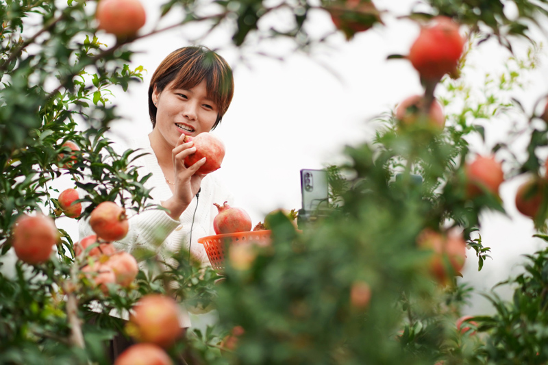 河北省邢台市内丘县五郭店乡东磁窑沟村农民在石榴园通过网络直播销售石榴(10月2日摄)。新华社记者 朱旭东 摄